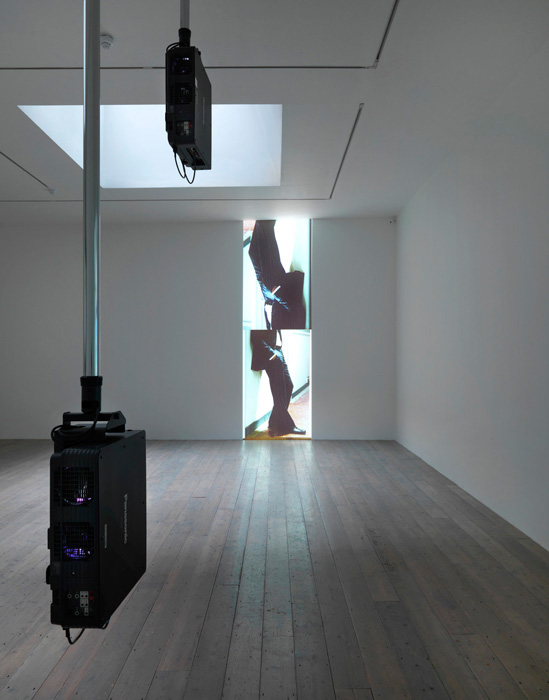 Hilary Lloyd, Trousers, 2010. 2 Panasonic PT-DW5100U Projectors, 2 Pioneer DVD-V7300D Players, 4 Unicol Suspension Units. Dimensions variable. Photograph by Marcus J. Leith. Courtesy of Raven Row.