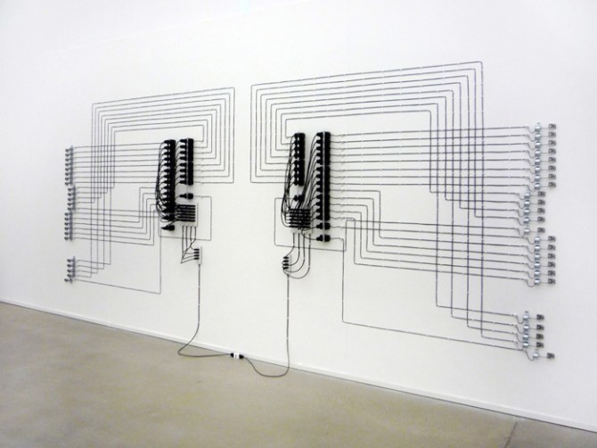 Julio Adán and the artist duo O Grivo are represented by painstakingly assembled sets of music machines. Although charming and precise exercises in mechanics they both lack the musical expertise of Felix Thorn (aka Felix’s Machines), for whom the machine is a way of producing experimental music and not just an aesthetic end in itself. The installation The Limitations of Logic and the Absence of Absolute Certainty (2010) by Alistair McClymont recreates a mini-tornado with the aid of fans within a metallic structure, so that we can witness the formation and hypnotic appearance of this natural phenomenon without any of the usual havoc.