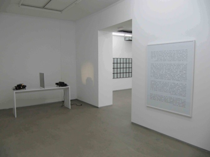 El Reflejo (The Reflection, 1977) welcomes the viewer into gallery. A large text piece, which revolves around the nature of mirrors and how they affect space, has its exact reversed version on the opposite wall. The play on symmetry is repeated in the neighboring Combate (Fight, 2004), where two empty slide projectors face each other in a mechanic duel of light and sound. The projectors are separated by a dark glass reminiscent of either a tennis net (a barrier between opponents) or a two-way mirror protecting anonymous audiences during interrogations. The references to political repression, quite subtle in this work, materialize on a grander scale in the next room. Half the wall space is occupied by Memorial (2009), a reproduction of the Montevideo telephone book presented in 196 framed prints. In it, the names of Uruguay’s desaparecidos (the 300 plus political dissidents that “vanished” during the military dictatorship) have been meticulously inserted between the rows of surviving citizens. Though present in this custom-made directory, the desparecidos’ names are still invisible in that they are graphically indistinguishable from those still alive, signalling perhaps the futility of the artistic act in the face of such political and moral atrocities.