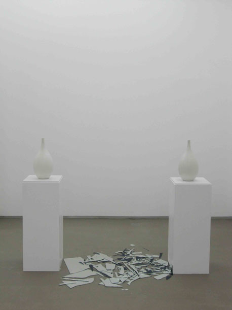 Also consisting of a series of prints on paper, Eco (2011) slices up a copy of Five Moral Pieces (1997) by Umberto Eco to then implement the re-assembling strategy of the Czech artist Jiří Kolář, whose existentialist deconstruction of texts and images is a strong point of reference for Camnitzer. At the far end of the second room, Homenaje a Mandrake (Homage to Mandrake, 2010) features two identical white vases on white plinths, separated by the scattered pieces of a shattered mirror. The title of the piece alludes to Mandrake, the Magician, the hero of a famous comic strip created by Lee Falk in 1934, when Camnitzer was only three years old. In one particular episode, following a plot worthy of Lewis Carroll or Jean Cocteau, Mandrake steps to the other side of a mirror to find all his friends and loved ones behaving like their evil twins and talking backwards.